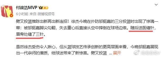 离场时,我们只知道徐杰眉骨撞裂了,可是伤情若何?缝了几针?我们一时不得而知。随后,按照前方媒体的报导,徐杰受伤去病院,眉骨缝了三针。媒体人付政浩深夜发文也证实了“随后送医缝针,眉骨处缝了三针。付政浩说这其实不是一个一般性的劈叉动作,邬挺嘉揭示出一代宗师的潜质,在劈叉根本上融会了传统技击勾脚尖的凤凰步,让你躲过初一也躲不外十五。